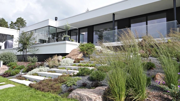 Loviisa elamumessi soosituima objekti õuenõlvad laskuvad looduslikult mereranna suunas. Modernse maja hästihooldatud õu muutub pisitasa mererannaks....